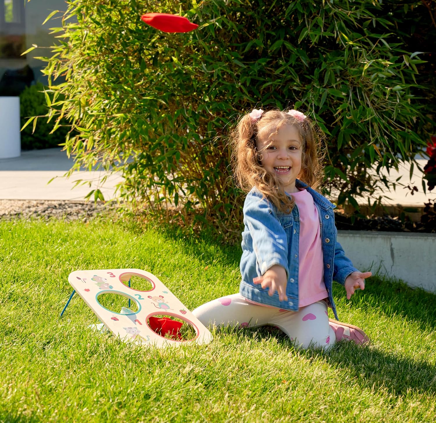Das Babywurfspiel ist ein unterhaltsames Geschicklichkeitsspiel für den Garten. Es umfasst ein Spielbrett mit klappbarer Metallstütze sowie sechs Wurfsäckchen. Auf dem Brett befinden sich drei unterschiedlich große Löcher, die jeweils mit verschiedenen Punktzahlen versehen sind. Gespielt werden kann allein oder zu zweit: Jeder Spieler wirft seine Säckchen, und nach einer festgelegten Anzahl von Runden gewinnt derjenige mit der höchsten Gesamtpunktzahl. Geeignet ist das Babywurfspiel für Kinder ab 3 Jahren.