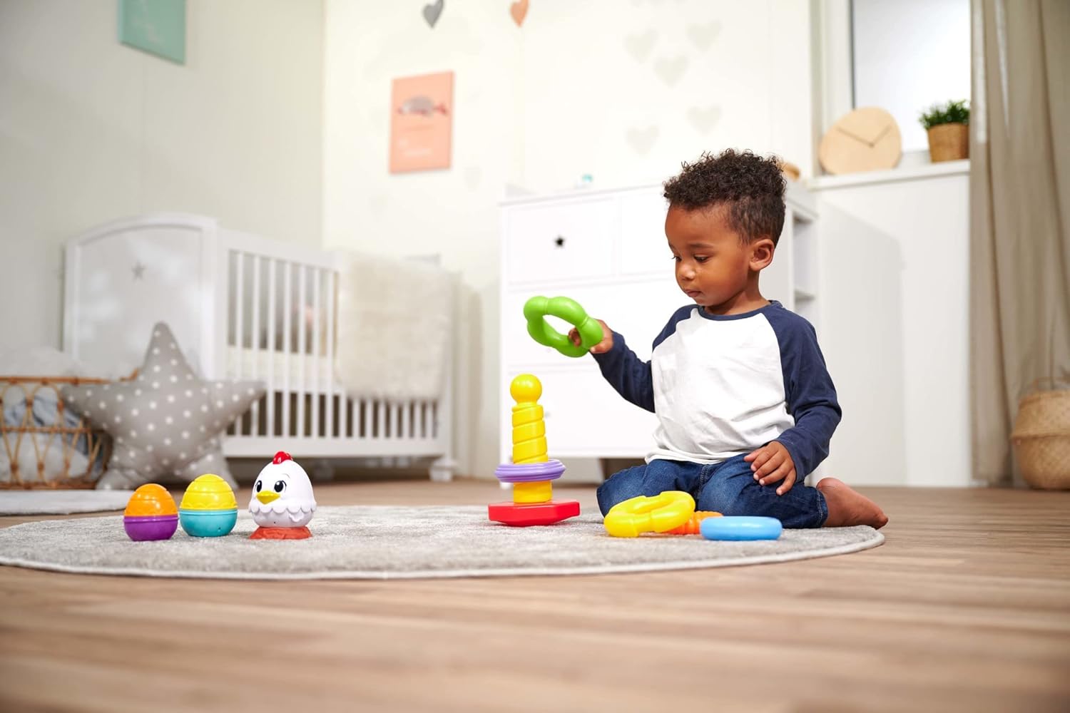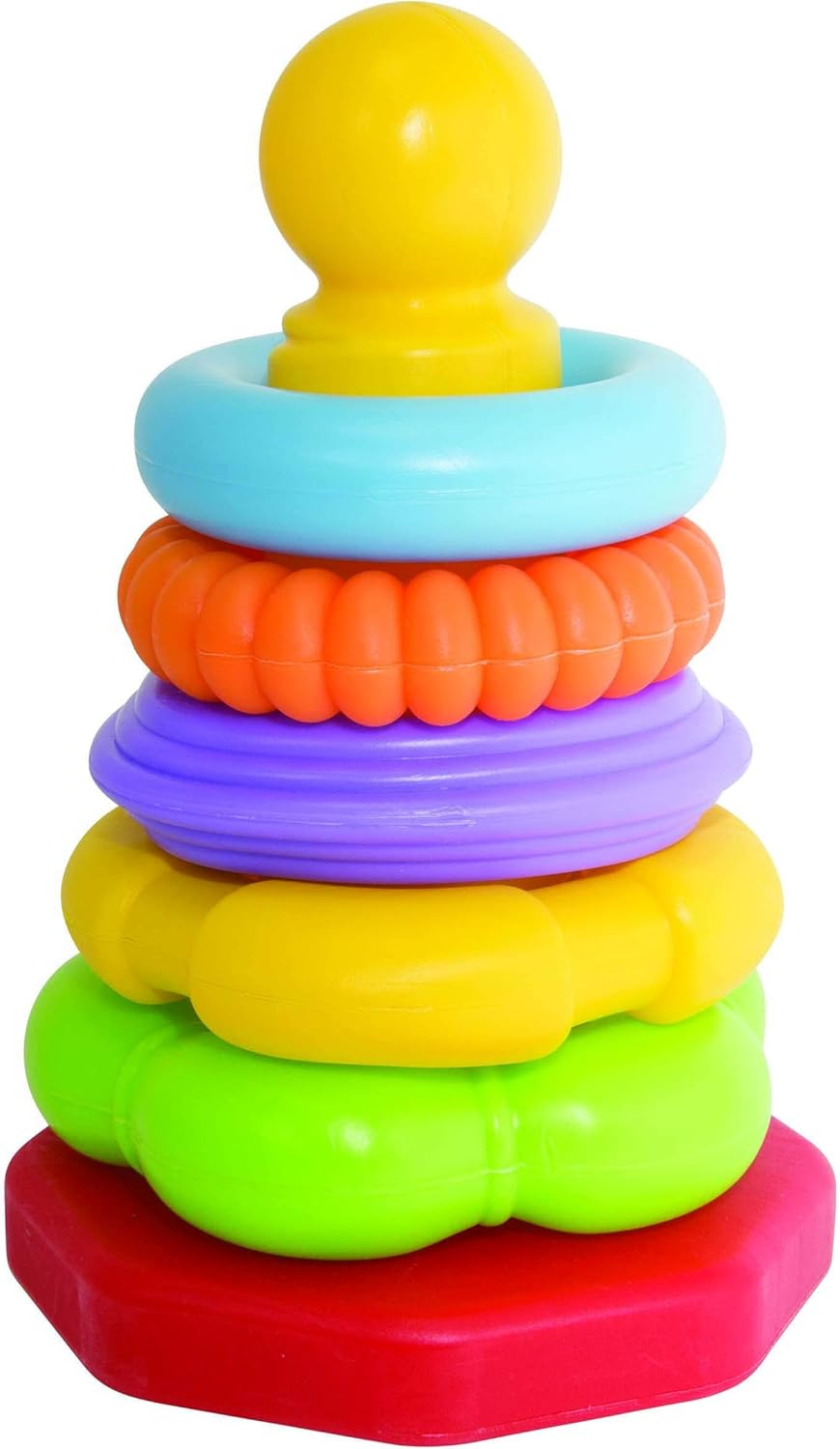 Das bunte Stapelspielzeug besteht aus fünf bunten Ringen auf einer Schaukelbasis, die Babys zum Greifen, Stapeln und Anstoßen animiert. Hergestellt aus pflanzenbasierten Materialien (mindestens 90 % Ethanol aus Zuckerrohr) und verpackt in FSC-zertifizierter Verpackung, vermittelt es spielerisch Größenunterschiede und unterstützt die Feinmotorik sowie Problemlösungsfähigkeiten. Geeignet für Babys ab 6 Monaten.