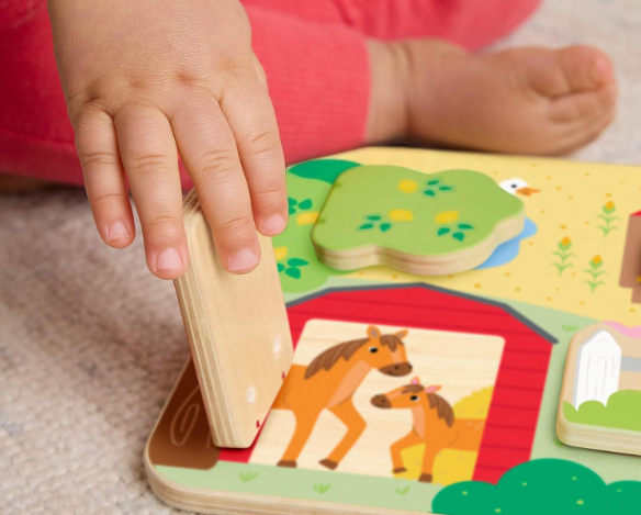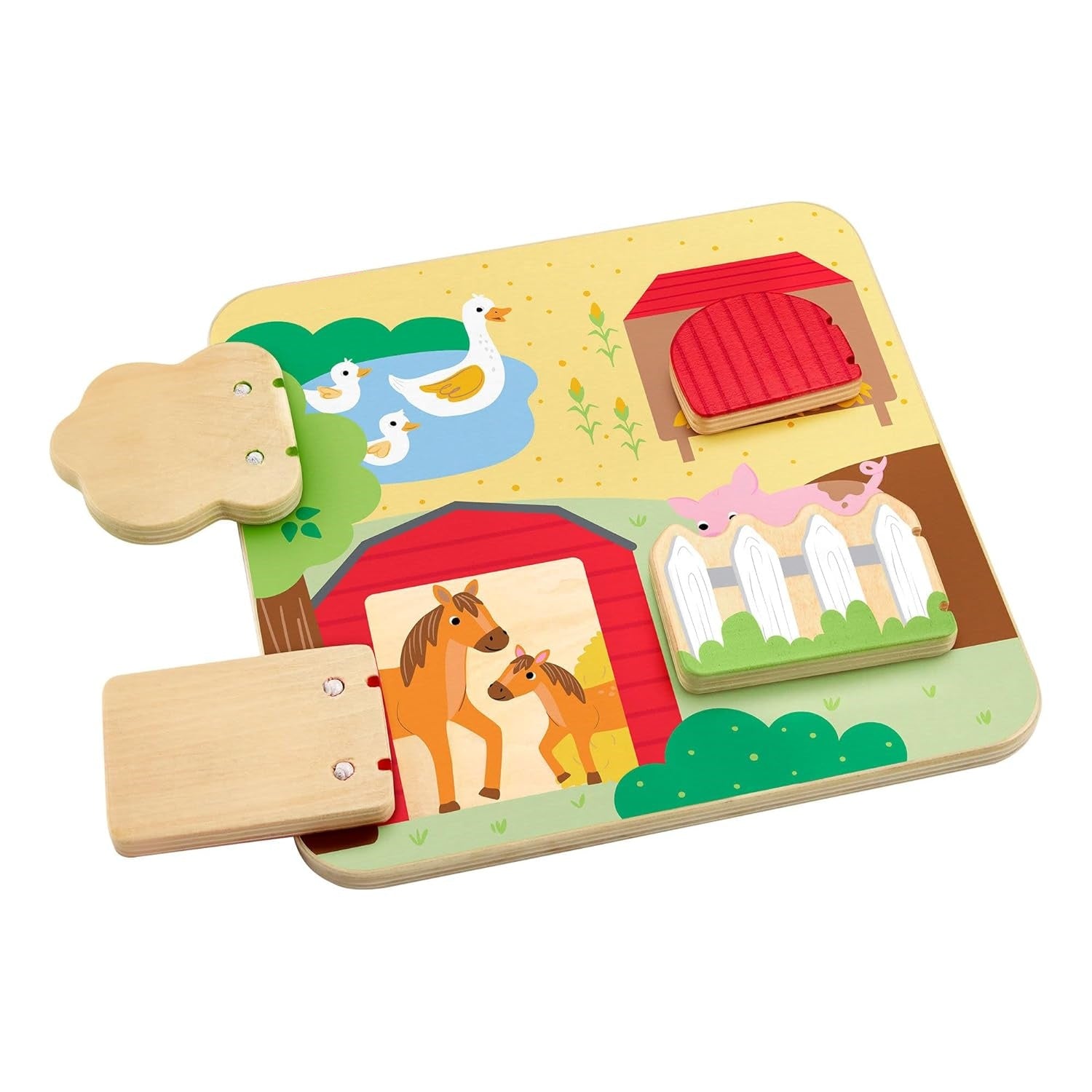 Das Guck-Guck-Aktivitätsspielzeug weckt die Neugier von Babys und Kleinkindern ab 1 Jahr, indem es hinter vier beweglichen Türen jeweils ein Tier mit seinem Jungen – Pferd mit Fohlen, Schwein mit Ferkel, Gans mit Küken und Huhn mit Küken – verbirgt. Beim Öffnen und Schließen der Türen sowie beim Entdecken der Tiere werden Feinmotorik, Hand-Auge-Koordination und Bewegungsfähigkeiten gefördert. Gleichzeitig lernen Kinder, die Tiere zu erkennen und zu benennen, was kognitive Fähigkeiten, Sprachentwicklung und die Freude am Entdecken der Tierwelt unterstützt.