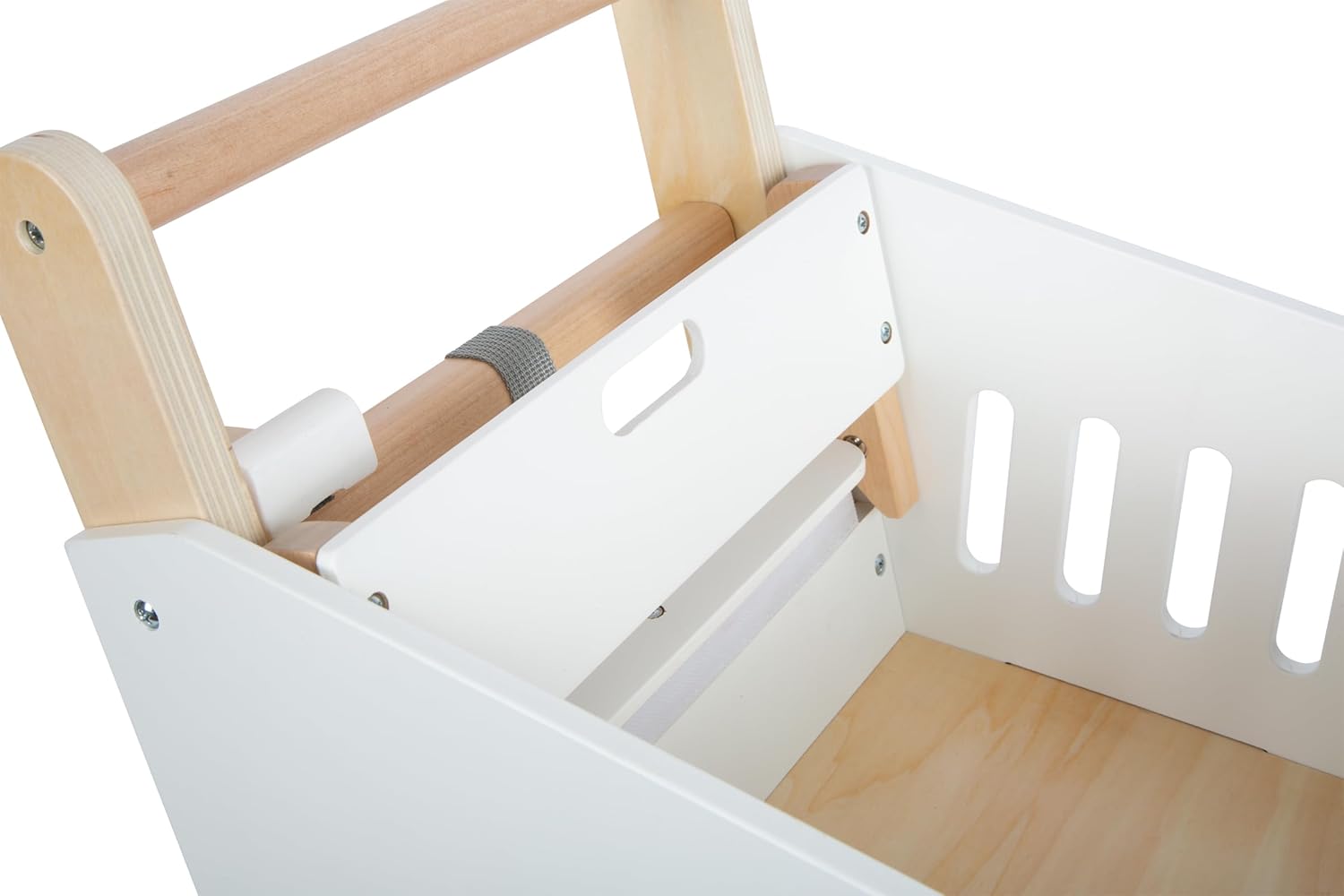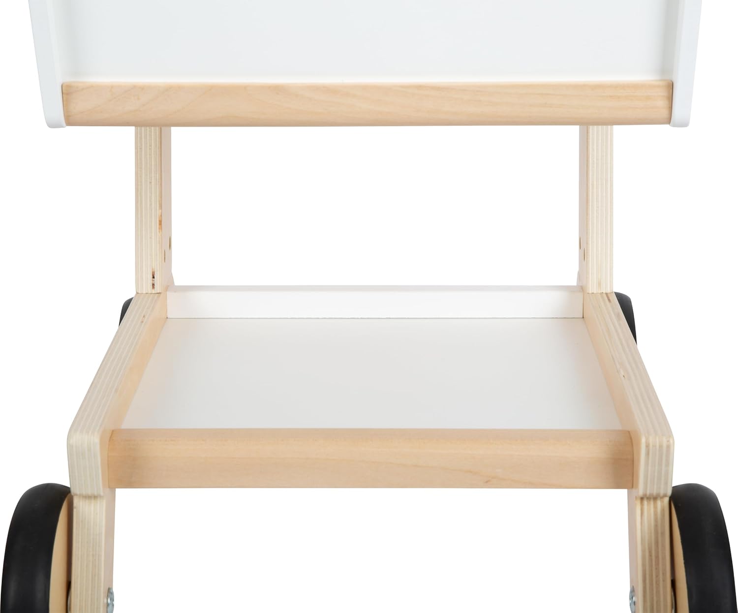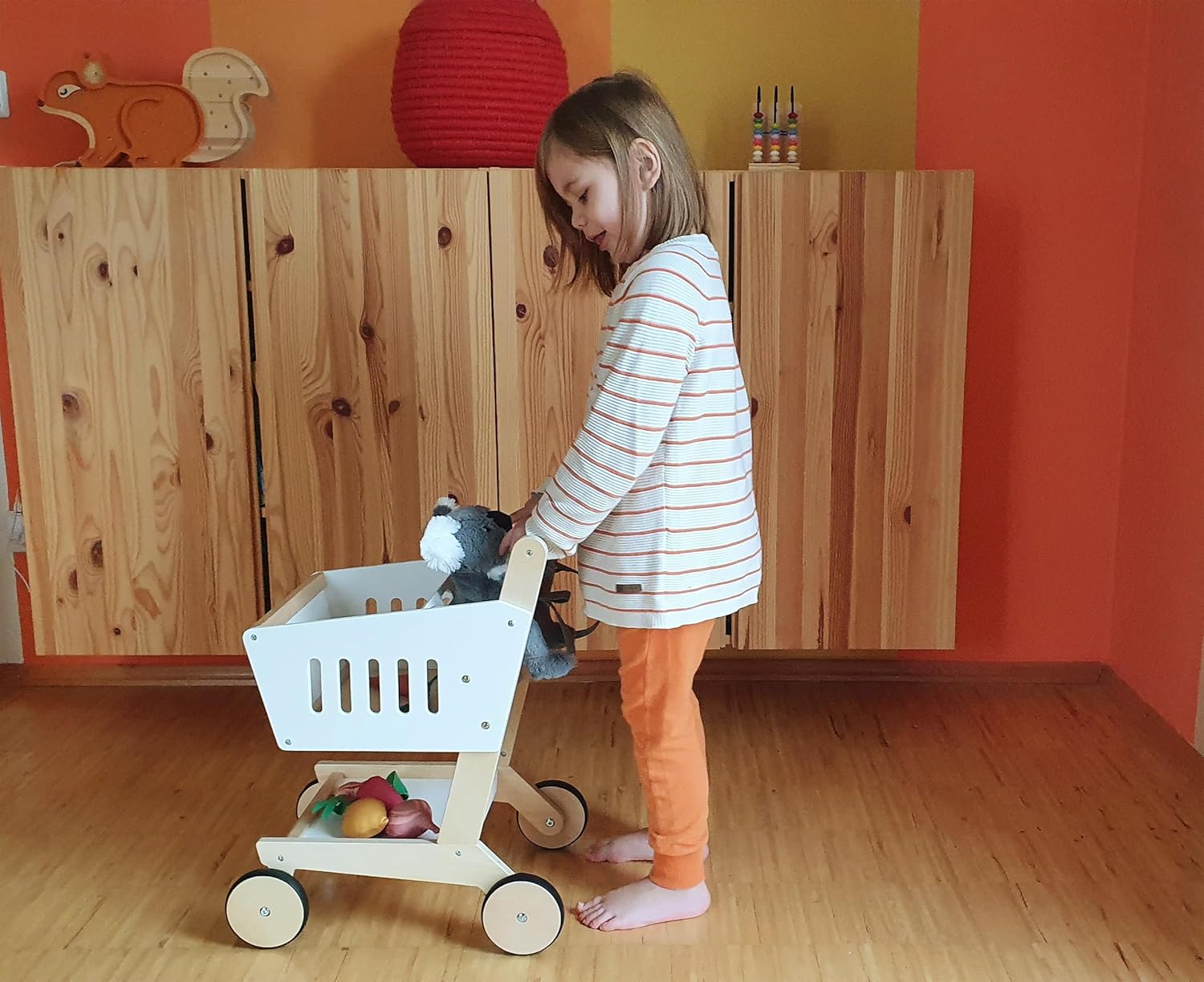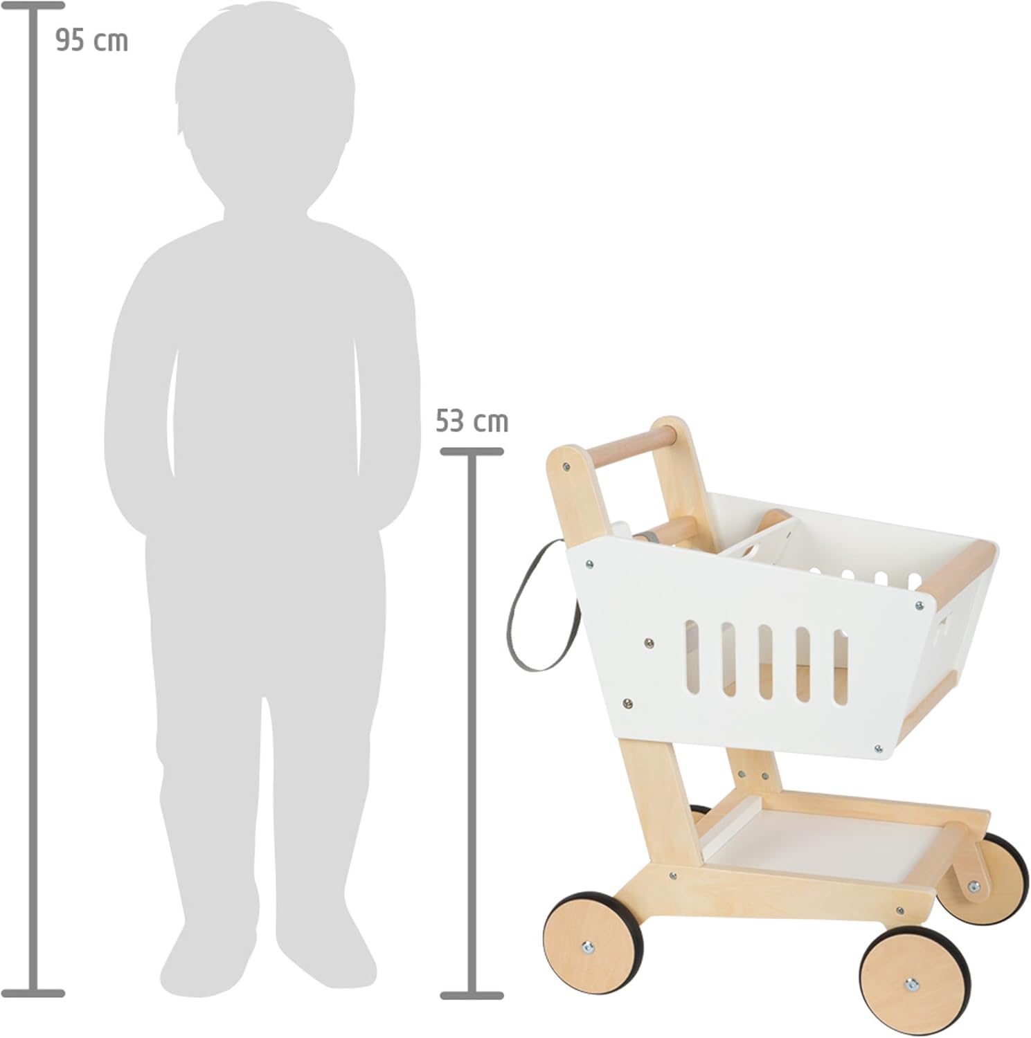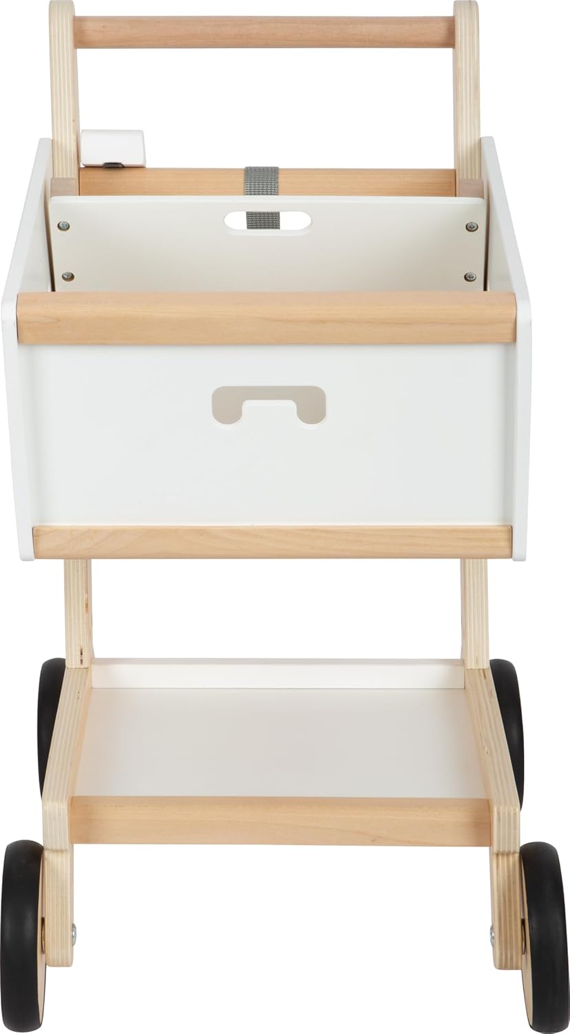 Dieser Holz-Einkaufswagen mit gummierten Rädern macht den Einkauf im Kinderkaufladen besonders realistisch. Mit magnetischem Einkaufschip, geräumigem Korb und Ablagefläche bietet er viel Platz für Spielwaren. Im Kindersitz fahren Puppe oder Teddy bequem mit, während eine Tasche das Spielgeld sicher verstaut. Die leisen, bodenschonenden Räder und der ergonomische Holzgriff sorgen für leichtes Schieben. Stabil, modern und genderneutral – perfekt für Rollenspiele oder zum Aufräumen im Kinderzimmer.