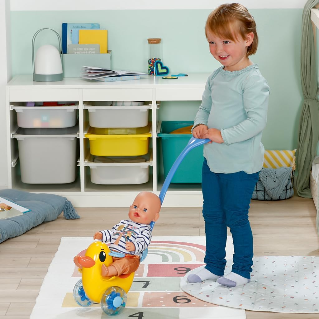 Der Puppenwagen passt sich dank abnehmbarer und größenverstellbarer Lenkstange optimal der Größe der Puppeneltern an. Die transparenten blauen Räder mit bunten Perlen sorgen für ein fröhliches Rasseln beim Schieben. Mit verstellbarer Rückenlehne und Fixiergriff finden Puppen der Größen 36 cm und 43 cm sicher und bequem Platz. Zusätzlich gibt es ein verstecktes Fach unter dem Sitz für Proviant oder kleine Schätze.