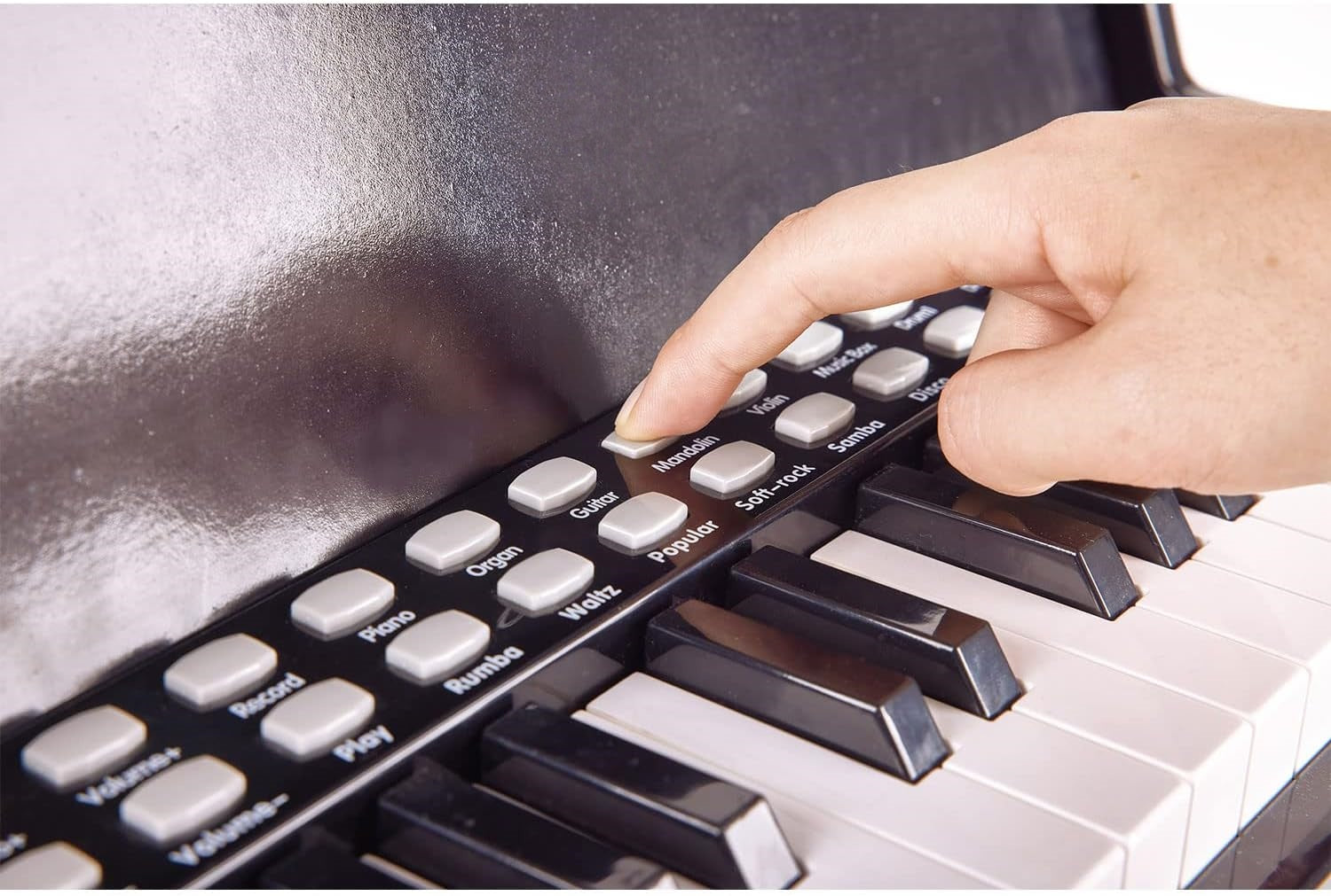 Das schwarze E-Piano st ideal für kleine Nachwuchsmusiker und verfügt über 25 Leuchttasten, die das Erlernen des Klavierspiels erleichtern. Mit 15 Demo-Songs und der Smart Play-Funktion, bei der immer die richtige Note erklingt, gelingt der Einstieg spielend leicht. Dank Aufnahme- und Wiedergabefunktion können Kinder ihre eigenen Stücke aufnehmen und anhören. Das Piano lässt sich auf zwei Arten betreiben und fördert spielerisch Kreativität, Musikalität und Selbstvertrauen.