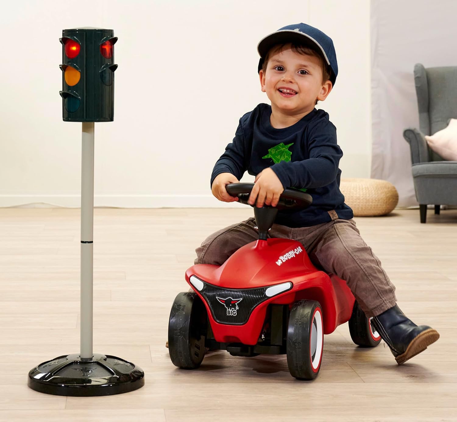Die Verkehrsampel mit Ampelmännchen und Ampelfrau kombiniert spielerisches Verkehrstraining mit dem Kultcharme des bekannten Berliner Ampelmännchens. Die detailreich gestaltete Kinderampel bietet realistische Funktionen wie einen automatischen Farbwechsel und zeigt dabei sowohl das Ampelmännchen als auch die Ampelfrau.